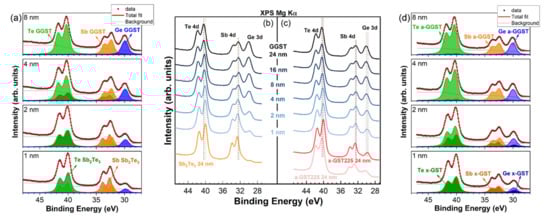 XPS was carried out by using an Omicron DAR 400 Al/Mg Kα non-monochromatized X-ray (Taunusstein, Germany) source and a 100 mm hemispherical VG-CLAM2 electron spectrometer (Uckfield, UK). For all the XPS experiments, different core levels were considered: Te 3d, Sb 3d, Te 4d, Sb 4d, and Ge 3d acquired with the Mg Kα line, and Ge 2p3/2 acquired with the Al Kα line. Binding energies were calibrated by setting the Au 4f7/2 core level at 83.95 eV, measured on an Au foil in electrical contact with the sample. The collected XPS spectra were analyzed and fitted by the KolXPD software (version 1.8.0) and libraries (http://kolxpd.com accessed on 8 August 2018) using Voigt functions and Shirley background.