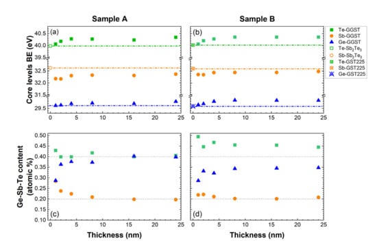 Core level BEs of the Sb2Te3 Te 4d and Sb 4d (open green square and orange circle, respectively), GST225 Te 4d, Sb 4d, Ge 3d (open crossed green square, orange circle, and blue triangle, respectively), and GGST Te 4d, Sb 4d, Ge 3d (green squares, orange circles, and blue triangles, respectively) for sample A (a) and sample B (b) as a function of the GGST layer thickness as estimated by fit deconvolution of the XPS spectra of Figure 1. The evolution of the composition of the GGST layer is shown for sample A (c) and sample B (d).