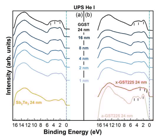As for the XPS experiments, UPS spectra of the heterostructures were collected during the formation of the interface after each deposition step of the GGST layer. The results are summarized in Figure 4, where a change in the UPS spectra line-shape is visible for both heterostructures already after the deposition of 1 nm of GGST, with the valence band maximum (VBM) progressively shifting towards higher BEs at increasing thicknesses (and increasing Ge content) of the GGST overlayer from 1 to 24 nm. The VB of the 24-nm-thick GGST has a mixed Te 5p, Sb 5p, and Ge 4p character in the region between 6 and 0 eV and, for both sample A and B, is characterized by a prominent peak at approximately 2 eV, and two broad features at approximately 3.5 and 5 eV. The same line-shape can be observed in the UPS spectrum of the as-grown a-GST225 layer of sample B (pink curve in Figure 3), with the VB showing the same three main features around 2.0, 3.5, and 5.0 eV, typical features of amorphous GST []. Upon annealing (red curve in Figure 4b), GST225 crystallizes and the VB shows a change in the line-shape with the formation of clear peaks at approximately 0.7, 1.8, and 3.0 eV of BE and the energy of the VBM shifting toward the Fermi level indicated by the green line in Figure 4. Such a shift can be ascribed to an increased hole concentration due to the formation of vacancies in the Ge/Sb sublattice [,,]. Interestingly, the experimental spectra for annealed x-GST225 have very close correspondence with the DOS calculated by DFT for an ordered trigonal t-GST structure []. The a- to x-transition of GST225 is also visible in the XPS spectra in Figure 2c (red curves). These observations, associated with a mixed 124/225 composition, suggest that annealing in UHV at 300 °C is effective in triggering the transition of a-GST225 to the trigonal phase. Similar results for the VB have been found by Klein et al. [] for cubic GST124, Caravati et. al. for cubic GST225 [,], and by Akola and Jones [] for cubic Ge-rich GST8 2 11.