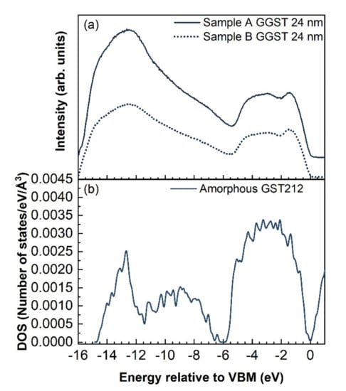 Comparison between (a) UPS spectra acquired on the two heterostructures after deposition of 24 nm of GGST and (b) DFT calculations of the DOS of amorphous GST212.