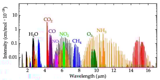 - Gordon, I.E.; Rothman, L.S.; Hill, C.; Kochanov, R.V.; Tan, Y.; Bernath, P.F.; Birk, M.; Boudon, V.; Campargue, A.; Chance, K.V.; et al. The HITRAN2016 molecular spectroscopic database. J. Quant. Spectrosc. Radiat. Transf. 2017, 203, 3–69. [Google Scholar] [CrossRef]