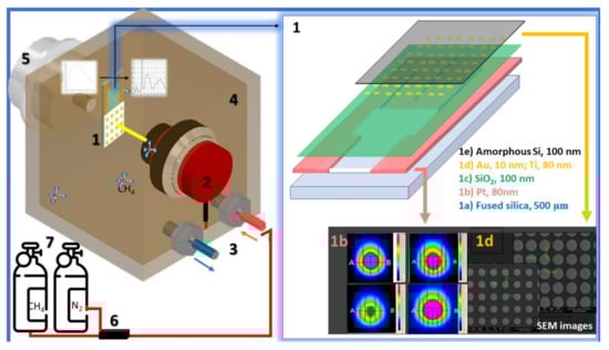 Conceptual diagram of the proposed gas sensing platform based on metamaterial structures integrated with a microheater. The sensor assembly is composed of: a (1) micro-IR source based on a metamaterial “perfect” absorber integrated with a microheater for selective gas sensing, which has the property to change the broadband emission of the microheater into a narrow and high-intensity emission band with the center wavelength overlapping the absorption peak of test gases; (2) thermopile detector; (3) two gas plug-ins (inlet and outlet); (4) gas chamber, where a mixture of an inert gas (N2) and a test gas is purged; (5) manometer; (6) mass flow controller for mixing nitrogen with toxic gases (e.g., CH4, CO2) in different concentrations; and (7) inert and test gases tanks. The narrow-band IR source (1) is composed of 5 layers: (1a) substrate, (1b) Pt heater (inset—thermal images obtained with an IR camera), (1c) SiO2 insulator, (1d) metasurface based on Au nanodisks (inset—SEM image), and (1e) amorphous Si.