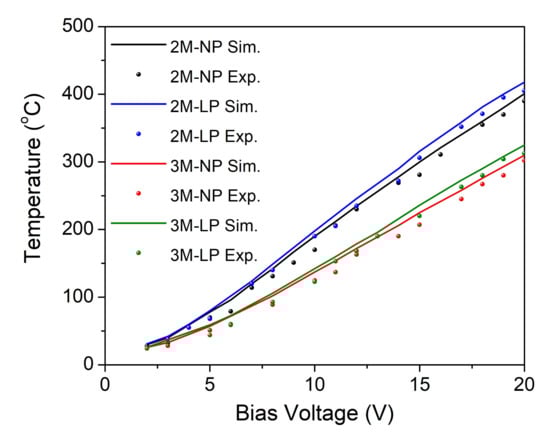 The results of the thermal characterization for all four proposed microheaters are shown in Figure 5. Here, the temperature variation as a function of the applied bias voltage for each microheater was registered in the center of the active area and compared with the simulations results. As can be seen in Figure 5, a very good correlation between simulation and experiments was obtained.
