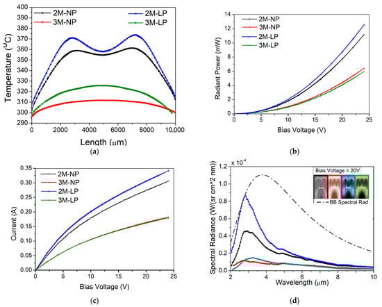 Characterization of four different microheater structures with: two meanders and narrow pads (2M–NP) (black), three meanders and narrow pads (3M–NP) (red), two meanders and large pads (2M–LP) (blue), three meanders and large pads (3M–LP) (green). (a) Temperature distribution, (b) radiant power, (c) I–V curve when a bias voltage of 0–24 V is applied, and (d) spectral radiance at 20 V.