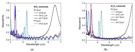 Differences between absorption spectra corresponding to IR emitter with (a) SiO2 versus (b) Al2O3 dielectric layer for several metasurfaces with different structures (P, metasurface period; d, disk diameter).