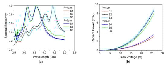 In order to determine the damage threshold of the systems, the radiant power change was measured for voltages between 0 and 32 V, and in the case of the S6 system, a spectral shift to larger wavelengths for voltages between 14 and 32 V was noticed (Figure 10). This shift of up to 50 nm, obtained by changing the voltage values, gives the user the possibility to tune the system around the absorption central peak of targeted gas molecules. The mean FWHM (full width half maximum) values obtained for the system with two meanders, large pads, a diameter of 1.6 μm, and a period of 3 μm were around 200 nm for the highest emitted peak and around 275 nm for the second one, showing the feasibility of this system to be used for gas detection applications.