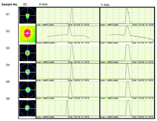 The radiant power trend is similar to the one of heaters as one can see in Figure 6b and Figure 8b, with the highest values obtained for the two-meander configurations. The maximum radiant power value obtained for the selective IR emitter was 7.3 mW in comparison with 12.5 mW obtained for the heater without the MPA attached, when a bias voltage of 24 V was applied. The current voltage curve of the IR system showed a behavior similar to that of the microheaters. The beam profile quality was also measured using an IR camera, and the results are presented in Figure 9 The beam profiles were measured at a distance of 96 cm between the IR emitter and the sensitive area of the camera when a bias voltage of 14 V was applied. All six configurations tested and presented here showed narrow and Gaussian beam profiles on both axes, X and Y. From the 2D beam profile can be seen the emitter uniform emissivity, concentrated in the center of the samples.