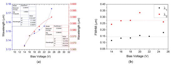 Sample S6 (a) wavelength spectral shift and (b) FWHM, variation for the main peaks depending on the bias voltage applied on the IR emitter pads. Peak characteristics: λ1 = 3.152 nm; λ2 = 3.579 nm, with corresponding FWHM1avg = 0.145 nm ± 0.021 mm and FWHM2avg = 0.277 mm ± 0.034 mm.