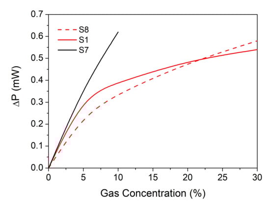 To prove the proposed sensor functionality, a gas chamber was developed (Figure 2, Section 4). The changes in optical power emitted by the narrow-band IR source that reaches the detector was measured when a toxic gas stream was introduced into the measurement chamber. By changing the ratios of toxic gas (test gas: CO2, CH4, CO) in the inert gas (nitrogen, N2 5.0, purity 99.999%), keeping the flow rate constant at 1000 L/min, it was possible to modify the concentrations of the introduced toxic gas. For example, to detect CO2 gas molecules, based on our findings from Section 3.2, we tested various IR emitters, which proved good emissivity properties (Figure 8a) in the spectral range where CO2 molecules absorb IR radiation. Figure 11 shows the variation of the optical power measured by the detector function on the CO2 concentration for three samples. The sensor that proved to be most sensitive to CO2 was S7. To demonstrate the proof of concept, preliminary results were obtained for CO sensing, using an S9 structure, and for CH4, using an S6 structure.