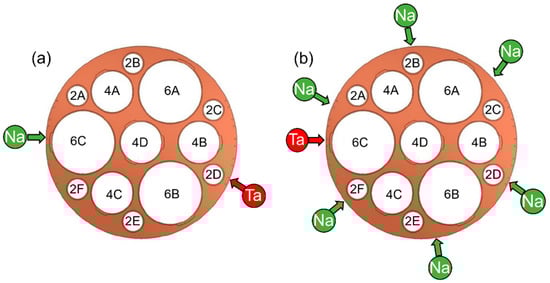 The depositions were carried out in a CBVD system able to accommodate a 450 mm diameter substrate (Sybilla-450, ABCD Technology, Ferney-Voltaire, France). A similar equipment (Sybilla 150) and the operating mode of this technique are described elsewhere [26]. Substrate heating is achieved by a graphite heating system radiatively heating the substrate up to 800 °C. Silicon <100> and quartz wafers (Siegert Wafer, Aachen, Germany) were used as substrates. By using a sample holder able to accommodate substrates of various sizes (Figure 1), thin films were deposited on 2” (silicon, quartz), 4” (silicon), and 6” (silicon) wafers. Two deposition configurations were used: (i) one active source for both Ta and Na (1-1 configuration, Figure 1a); (ii) one active source for Ta and six for Na (1-6 configuration, Figure 1b).