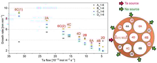 Measured average growth rate as function of the Ta flow calculated for each position of the samples in 1-6 batches. On the right, the schematic of the sample holder with the corresponding positions in red. The samples 6C(1) and 6C(2) come from the left edge and right edge, respectively, of the wafer 6C. The other samples come from the center of the respective wafers. Error bars refer to the Ta flows calculated at ±5 mm away from the point where thickness measurements were performed, thus considering possible measurement errors related to the positioning of the sample.