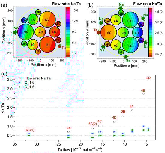 Flow simulations for (a) 1-1 and (b) 1-6 batches. In the latter case, scale values for Na/Ta flow ratios are for depositions C and D (target VPNa= 0.01 mbar), while values in brackets are for depositions A and B (target VPNa= 0.02 mbar). (c) Comparison between the measured Na/Ta by XPS and Na/Ta calculated from flow simulations in batches C_1-6 and D_1-6. For the position of the samples and active sources, refer to Figure 2. Error bars refer to the Ta flows calculated at ±5 mm away from the point where thickness measurements were performed, thus considering possible measurement errors related to the positioning of the sample.