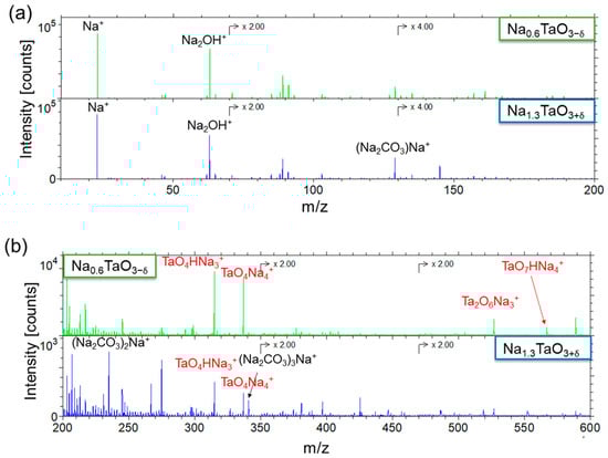 Positive ion ToF-SIMS spectra of Na0.6TaO3-δ and Na1.3TaO3+δ in the m/z range (a) 100–200 and (b) 200–600. Both samples were obtained from batch 1_1 (positions 4B and 6C(1), respectively). Only signals ascribed to Na1+xTaO3±δ and Na2CO3 are reported. The secondary ions characteristic of Na1+xTaO3±δ are labelled in red.