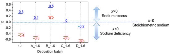 A wide composition range was also obtained in the batch A_1_6 (−0.4 ≤ x ≤ 0.3), deposited at the lowest temperature and highest Na flow. Here, all the samples were characterized by oxygen deficiency (see Table S2) even in presence of sodium excess (i.e., x > 0). This charge unbalance can be due to the lack of a perovskite-structured material with possible deviations from the proposed A1+xBO3±δ stoichiometry, as discussed in Section 3.3. Finally, batch B_1-6 presented over-stoichiometric oxide (0.2 ≤ x ≤ 0.5) across the whole deposition area.