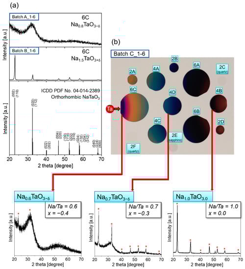 (a) XRD patterns of the sample located in 6C position in batches A_1-6 and B_1-6. (b) Photographic picture of the batch C_1-6 with the XRD patterns of the samples 6C, 4D, and 4B.