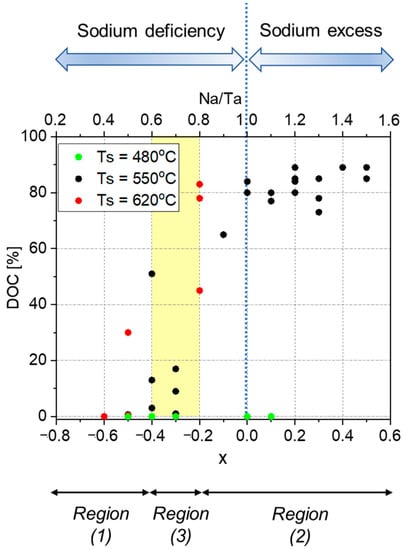 The tight correlation between stoichiometry and crystallinity, with the latter expressed in terms of the DOC, is highlighted in Figure 7, where a total of forty points across the deposition area, from all the deposition sessions of the present study, have been analyzed. Amorphous structure was observed at Ts = 480 °C at any stoichiometry. On the other hand, at temperatures of 520–620 °C, high enough to trigger the growth of perovskite-structured Na1+xTaO3±δ, the crystalline order depended solely on the composition. Indeed, three main regions stand out: