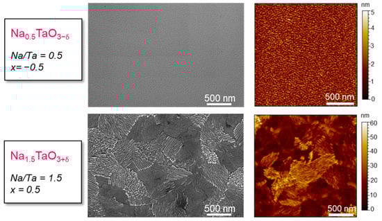 SEM (left) and AFM (right) images of Na0.5TaO3−δ and Na1.5TaO3+δ. The morphology confirms high crystallinity and the amorphous character of Na1.5TaO3+δ and Na0.5TaO3−δ, respectively.