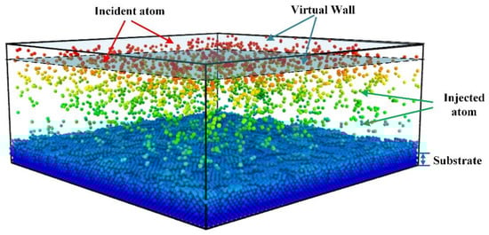 As with the sputter deposition experiments, a copper substrate was set up at the bottom of the system. The substrate is divided into three zones, including a fixed zone, a thermally controlled zone and a free zone. In the thermally controlled area a Langevin thermostat is set to maintain the temperature at 300 K. The injected atoms leave the incidence plane and reach the free zone. Two important sections are set up at the top of the simulation box. The incident layer is located one lattice distance from the entire top of the box. As shown in Figure 2, two virtual walls are set up to prevent the emitted atoms from leaving the system. The frequency of the emitted atoms was controlled so that the Ta content approximately met that of the experimentally prepared amorphous film. The boundaries are set to be periodic in the x and y directions and contracted in the z direction.