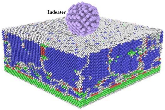 Next, the output of the deposition simulation can be used as the initial model for the indentation. The indentation model is shown in Figure 3. A virtual sphere indenter with a radius of 3 nm is set at the top center of the deposition output model. The distance between the indenter edge and the top of the deposition output model is 1 Å. The speed of the indenter downwards is set to 2 Å/s. At the start of the simulation, energy minimization and relaxation were performed to bring the system to an equilibrium state with minimum energy. During the indentation test, the model boundary was set to be periodic in the X and Y directions and contracted in the Z direction.