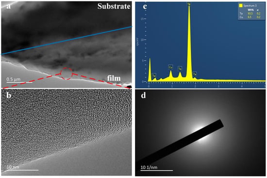 The internal structure of the prepared Cu3.5Ta96.5 films was characterized using a JEM-2100 F TEM. First, a 1 µm slice was cut out at the interface between the film and the substrate using Focused Ion beam (FIB), and the thickness of both the substrate and the film was about 500 nm. As can be seen in Figure 4a,b, there is no apparent array arrangement inside the film, which is in a distinctly amorphous state. To further verify this, the red circle in (a) was characterized by selected area electron diffraction and the image was found to be a distinct aperture as shown in Figure 4d, which further confirms that the prepared film is amorphous. Figure 4c shows the EDS spectrum of the atomic composition of the film, confirming the Ta content.