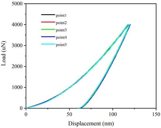 The results of the nanoindentation experiments are shown in Figure 5, which can be illustrated by the complete load-displacement curve. The hardness and elastic modulus are 14.4 GPa and 156.7 GPa, respectively.