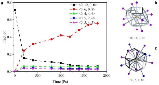 The change of Voronoi polyhedron with the increase of deposited atoms. (a) <0,12,0,0>, <0,6,0,8>, <0,4,4,6>, <0,5,2,6> and <0,5,4,5> fractions with the deposit time; (b) the structure of <0,12,0,0> Voronoi cell; (c) the structure of <0,6,0,8> Voronoi cell. (For structural clarity, the central atom is indicated in yellow and the other atoms in purple or blue).