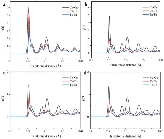 The RDF profile of deposit Cu-Ta model at different time. (a) 200 Ps; (b) 800 Ps; (c) 1200 Ps; (d) 1800 Ps.