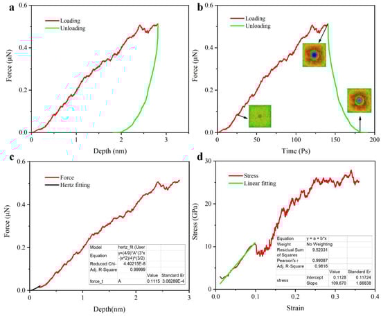Indentation load curve. (a) Load-depth curve of simulated Ta-rich deposition output model; (b) Time-force of nanoindentation, three sub-images relate to the indentation depth at that time; (c) Load-depth curve of loading stage and Hertz fitting; (d) Strain-stress curve transfer from load-depth curve.