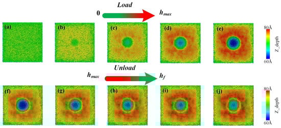 Dynamic loading and unloading process. (a–e) represent the process of load increase, (f–j) represent the process of unloading. The atoms are colored according to the depth in the loading direction (Z direction).