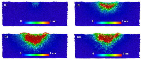 To show more clearly the displacement of atoms inside the film during the indentation process. Figure 10 shows the displacement of atoms in the XY-plane for different indentation depths using the slice method. The color of the atoms is determined by the size of the displacement. Figure 10c corresponds to a maximum indentation depth of 2.8 nm and (d) to the state of the atoms inside the model after unloading. At the same time, there is a clear “indentation” during loading, as shown by the red outline in Figure 10c. As the indenter penetrates into the film, the surrounding surface of the film bulges, forming a small convex surface. This is the “Pile-up” phenomenon, where it is known that the Oliver-pharr method is no longer applicable, which is why we use the Hertz model in simulation. The distribution of atoms during the indentation process shows that the atoms on the original free surface have two trends of movement: one is the part of the atoms that moves downward with the indenter, i.e., the red part, and the other is the green atoms that occur in the Pile-up region. The green atoms are bulged by the joint action of the indenter and the surrounding atoms to form a convex package. After the unloading is completed, it can be seen from Figure 10d that some of the red atoms diffuse into green or yellow atoms due to the elastic effect. There are also light blue atoms in the lower part of the entire hemisphere due to plastic deformation, and according to their distribution, it can be approximated that if the indentation load continues to increase, these areas will become sprouts for crack expansion.