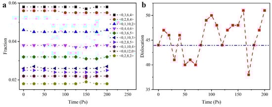 Figure 11 shows the displacement of the atoms during the indentation process, we then used the dislocation analysis (DXA) method [] to calculate the dislocations in the XY plane at a distance of 1.5 nm from the indentation surface. At the same time, the variation of the Voronoi cells was accounted for. In general, the variation of the Voronoi cells during the indentation process is not very significant and most of the structures remain at a stable value. Only the Voronoi cells of <0,2,8,4> and <0,2,8,5> decreased by 0.1% at 50 Ps and then remained at this value. The change in the number of dislocations allows a better analysis of the changes in the internal structure of the film. It can be seen that there are still many defects in the initial state model. As the indenter penetrates deeper into the substrate, the number of in-plane dislocations changes significantly. From 80 Ps onwards, the number of dislocations increases significantly, which also corresponds to the end of the fitted curve in Figure 8c. In our calculations, we consider this moment as the time of initial dislocation emission. Subsequently, the number of dislocations at 160 Ps decreases rapidly. At this moment, the indenter starts to leave the substrate surface and the internal dislocations decrease. However, a few dislocations still occur during the recovery of the film. The number of dislocations remains constant until the indenter leaves the substrate completely.