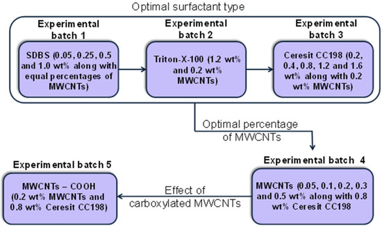 The different experimental batches produced in the present study can be seen in Figure 2. Initially, the investigation included the optimal surfactant type (experimental batches 1–3). Following this, using the optimum surfactant type and its concentration, respectively, the effect of the MWCNT concentration was investigated (experimental batch 4). Finally, the possible effect of MWCNT carboxylation was studied (experimental batch 5).