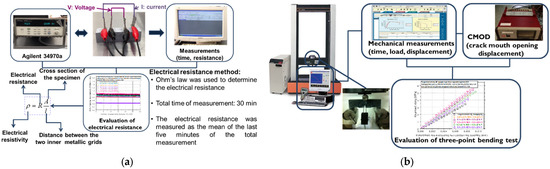 An Agilent 34970a multimeter (Santa Clara, CA, USA) was used in situ to record the electrical resistance data of the specimens through the embedded metallic grids, Figure 3a. The resistance measurements were performed in a four-point measurement set up in the longitudinal direction following Ohm’s law. The internal electrodes were used to measure the voltage, while the outer electrodes provided a continuous supply of constant current. The electrical resistivity was calculated according to Ohm’s law taking into consideration the specimens’ electrical resistance and external dimensions (see Figure 3a). Data acquisition of 1 Hz was used for the resistance measurements, while the data were simultaneously transmitted in the P/C of the testing machine for a minimum of 30 min. The electrical resistivity of the samples was determined as the mean value of the electrical resistivity values during the last five minutes (25 up to 30 min) of testing.
