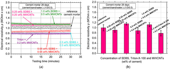 Figure 4a depicts the typical electrical resistivity curves of the MWCNT-reinforced white cement mortar specimens; the specific MWCNT concentrations were dispersed using the SDBS and Triton X-100 surfactants, respectively. Electrical resistivity of the reference (no MWCNTs reinforced) cement mortar exhibited resistivity values around 1 ΜOhm·cm with increased amplitude/variability of the experimental measurements. The addition of both surfactants decreased the amplitude of the measurements, nevertheless, the improvement in electrical properties remained unclear for the case of the SDBS surfactant. In Figure 4b, the average values with the respective standard deviation of the experimental electrical resistivity measurements are shown. A small improvement (reduction) could possibly be noticed for the low SDBS concentrations. Addition of the Triton X-100 surfactant seems to be beneficial for the electrical resistivity values since almost 20% lower electrical resistivity was measured. As a general observation, the use of these two surfactants slightly decreased the electrical resistivity, especially for the low concentration specimens. Nevertheless, this decrease was marginal and within the standard deviation of the measurements.