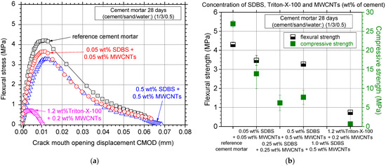 Typical flexural stress–crack mouth opening displacement curves for the investigated surfactants to disperse the MWCNTs can be seen in Figure 5a. It seems that all investigated cases decreased the flexural strength (peak flexural stress) of the specimens and generally a more brittle behavior was noticed. Particularly for the 0.25 and 1.0 wt% SDBS specimens, all samples were fractured immediately after the initiation of the mechanical testing and therefore their flexural mechanical behavior was not recorded and presented. Similarly, in the case of the Triton X-100 surfactant, large pores were noticed, and the specimens were almost destroyed after demolding (Figure 6). To this end, the lowest flexural strength of less than 1 MPa does not seem to be a surprising result.