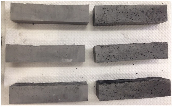 The use of a commercially available superplasticizer was investigated for the efficient dispersion of the MWCNTs before mixing in the white cement mortar matrix, since the previously investigated surfactants did not succeed in achieving increased mechanical properties in the white cement mortar. This was due to morphological differences (i.e., increased porosity) that are evident even at the macroscale (Figure 7) when looking at the samples’ outer surface. The MWCNT/white cement mortar dispersed using a superplasticizer demonstrated a smoother outer surface. In contrast, the samples with the SDBS surfactant had large macroscopic pores.