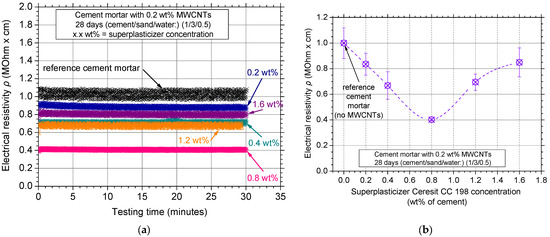 Superplasticizers are surfactants typically used in cementitious materials to improve their workability and normally do not influence the mechanical properties of the cementitious matrix [40,41]. To this end, a typical concentration of 0.2 wt% MWCNTs was selected from the literature [42,43] as a constant concentration to investigate the effect of superplasticizer concentration on the MWCNT dispersion. Figure 8a shows the typical electrical resistivity curves of the investigated mortars reinforced with a 0.2 wt% MWCNT concentration; the MWCNTs were mixed in solutions that had various superplasticizer concentrations. The addition of MWCNTs decreased the electrical resistivity values; the 0.8 wt% superplasticizer concentration resulted in the lowest measured electrical resistivity value. Average values and standard deviation of the average electrical resistivity values can be seen in Figure 8b for the various superplasticizer concentrations. The available experimental test results were connected with the aid of a B-Spline curve (eye-catch) for the convenience of the reader. It is evident that electrical resistivity values decreased with an increase in the superplasticizer concentration up to the minimum observed for the case of 0.8 wt% Ceresit concentration, indicating that lower surfactant concentrations are not sufficient to homogeneously disperse the MWCNTs. For this specific concentration (0.8 wt% of cement), the standard deviation of the experimental measurements was the lowest measured, thus proving the high reproducibility among the different investigated specimens of the same batch as well as the high dispersion condition of the MWCNTs. Higher superplasticizer concentration (>0.8 wt%) led to a significant increase in electrical resistivity. This suggests that the MWCNT dispersion in the matrix was not efficient, as an excess amount of the Ceresit CC 198 superplasticizer caused flocculation of the surfactant molecules.