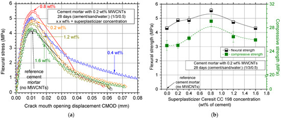 Figure 9a shows typical flexural stress–crack mouth opening displacement curves for the investigated superplasticizer concentrations. It is obvious that the superplasticizer concentration influences the flexural behavior of the MWCNT reinforced white cement mortar specimens. Small concentrations seemed to slightly increase the flexural behavior of the specimens; the 0.8 wt% concentration exhibited the highest increase in the peak value of the flexural curve. Higher concentrations (>1.2 wt%) decreased the maximum values of the respective curves, which might be caused by the insufficient nano-reinforcement dispersion.