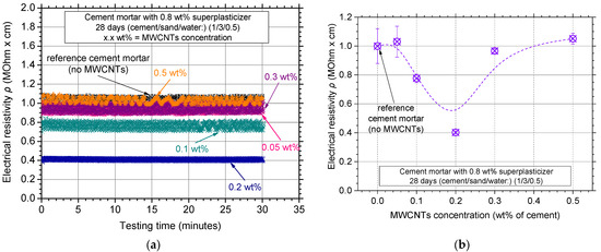 Figure 10a shows the typical electrical resistivity experimental curves of the mortar specimens for the various MWCNT concentrations investigated. It is evident that almost all the additions decreased the electrical resistivity of the white cement mortar matrix. The lowest value of electrical resistivity was measured for a 0.2 wt% MWCNT concentration, possibly due to the development of a more uniform MWCNT distribution network. The electrical resistivity results with average values and standard deviation for the investigated MWCNT concentrations can be seen in Figure 10b. All specimens presented low scatter in electrical resistivity and an eye-catch dotted line was also plotted. Electrical resistivity seemed to decrease up to a 0.2 wt% concentration, while ρ increased for higher concentrations.