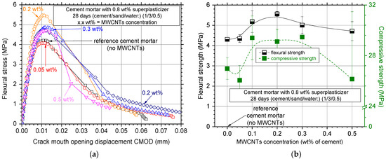 Typical experimental curves of flexural stress–CMOD can be seen in Figure 11a for the investigated MWCNT concentrations. It is evident that all MWCNT additions had a profound effect on the flexural strength of the specimens, with the optimal concentration being around 0.2 wt%. Lower concentrations could not sufficiently reinforce the matrix, while non-uniform dispersion of the reinforcement might be the reason for the flexural strength decrease for higher concentrations.