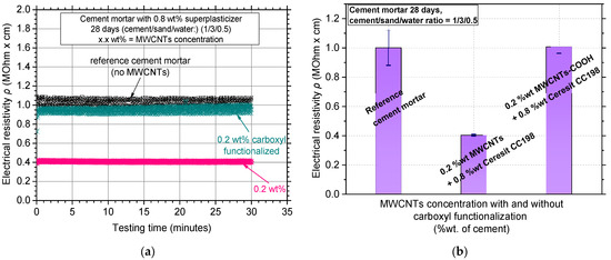 (a) Electrical resistivity curves over testing time and (b) average electrical resistivity values of MWCNT/white mortar nanocomposites where MWCNTs were treated with and without carboxyl functionalization.