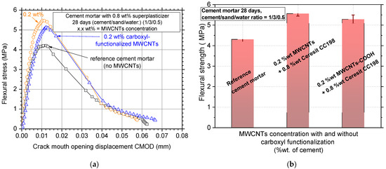 (a) Typical flexural stress–crack mouth opening displacement curves and (b) average flexural strength values and standard deviation of MWCNT/white mortar nanocomposites where MWCNTs were treated with and without carboxyl functionalization.