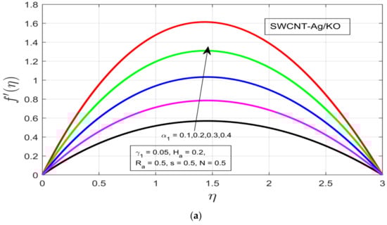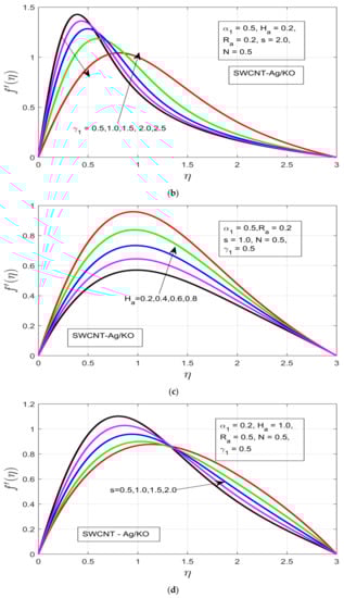 (a) Impact of the rotational ratio α1 on f′(η). (b) Impact of the buoyancy parameter γ1 on f′(η). (c) Impact of the Hartman number Ha on f′(η). (d) Impact of the unsteadiness parameter s on f′(η).