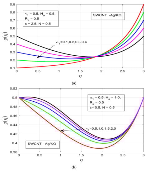 (a) Impact of the rotational ratio α1 on g(η). (b) Outcome of the buoyancy parameter γ1 on g(η). (c) Impact of the Hartman number Ha on g(η). (d) Impact of the unsteadiness parameter on g(η).