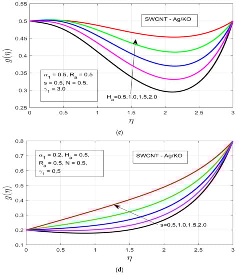 The influences of different study constraints are discussed here on both profiles . Figure 2a–d demonstrates the influence of the rotational ratio, buoyancy parameter, Hartman number (magnetic field), and unsteadiness characterization parameter on . As the rotation increases, an increment can be observed in the boundary layer thickness of the hybrid fluid motion (see Figure 2a) for the azimuthal velocity . The increased exerted pressure gradient , which acts as applied positive pressure, decreases the azimuthal velocity resulting from the decline in the thermal boundary layer of the magnetized fluid (see Figure 2b). Figure 2c shows the impact of the Hartman number on the azimuthal velocity , where the increasing magnetic field generates enough Lorentz force to oppose the fluid motion but a contrast pattern is visible for the selected hybrid nanofluid (SWCNT-Ag/KO), while the temperature boundary enlarges under the increasing magnetic field . Figure 2d shows that the impact of the unsteadiness parameter on the azimuthal profile decreases with increasing unsteadiness in the fluid behavior, resulting in a decrease in the thermal boundary layer of the flow motion.