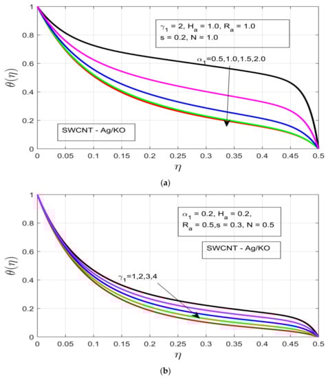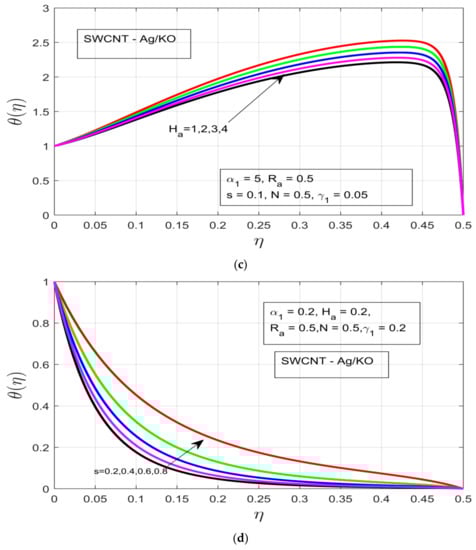 (a) Influence of the rotational ratio α1 on the temperature profile θ(η). (b) Impact of the buoyancy parameter γ1 on the temperature profile θ(η). (c) Impact of the Hartman number Ha on the temperature profile θ(η). (d) Impact of the unsteadiness parameter s on the temperature profile θ(η).