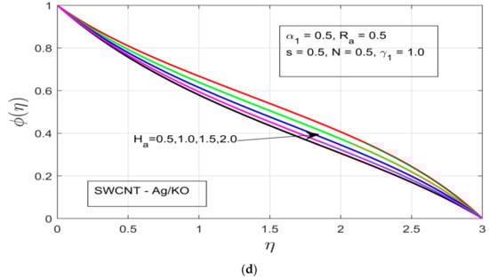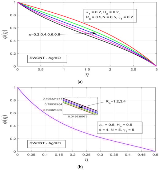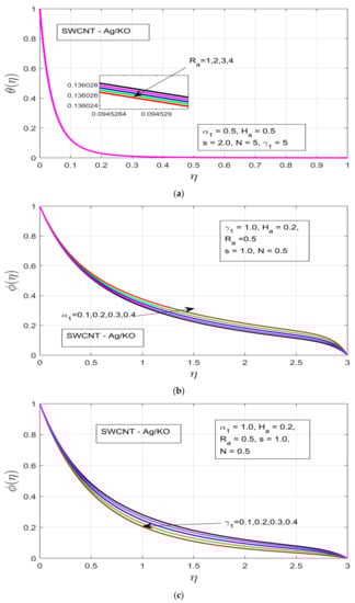 Figure 5a–d demonstrates the influence of distinct study constraints on the behavior of the concentration profile. The radiative impression on the thermal boundary layer of the temperature profile can be observed in Figure 5a, where an applied magnetic field resistance force is created in the flow motion, which does not increase the thermal boundary—instead the thermal boundary layer contracts. Figure 5b illustrates the influence of the rotational ratio on the concentration , whereby the concentration layer of the flow decreases as we increase the rotation of the fluid. Figure 5c depicts the impact of the buoyancy force on the concentration layer. The increasing pressure gradient decrease the concentration layer, which occurs due to the presence of a strong exerted pressure and high resistive force. Figure 5d and Figure 6a illustrate the behavior of and unsteadiness characterization parameters . Under both parameters the concentration profile is decreased, which happens due to the presence of a strong resistive force, which ultimately results in the decline of the concentration layer of our hybrid nanofluid. Figure 6b demonstrates the concentration layer of the magnetized fluid. It can be observed that the concentration layer also contracts under the incremental influence of radiation parameters.