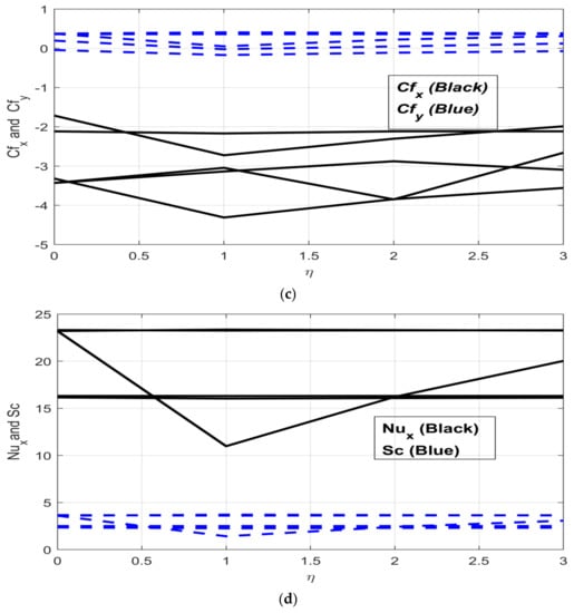 The coefficients of drag force, termed “skin friction coefficients” , along with heat and mass coefficients Nusselt and Sherwood numbers, respectively) are discussed in Figure 6c,d. The data for skin coefficients and heat and mass coefficients are provided in Table 1. Figure 6c shows the skin friction coefficients under increasing study constraints. The skin coefficient decreases while the skin friction coefficient in the y-direction increases under the same increasing influence of study parameters . Figure 6d depicts heat and mass transfer coefficients, where the increasing radiation has no impact on either the heat or mass transfer , as both stay consistent. Then, under increasing unsteadiness characterization of flow motion, both decrease to , but both then increase again to .