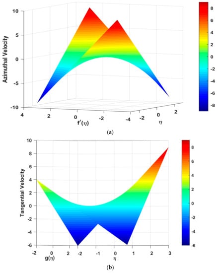 where is the similarity variable; are dimensionless velocity components in the azimuthal and tangential direction, temperature, and concentration for the PWT, respectively. The Grashof numbers are represented by while the buoyancy forces for temperature and concentration are represented by , respectively. The Grashof number ratio is and L is the characteristic length. The ratio of the angular velocity of the cone to the composite angular velocity is presented by are the Prandtl and Sherwood or Schmidt numbers, respectively, while s describes the unsteadiness characteristic of the fluid.