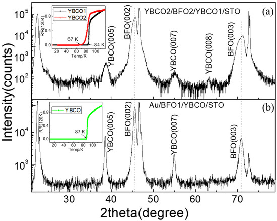 X-ray diffraction images of the YBCO2/BFO2/YBCO1 and Au/BFO1/YBCO capacitors are shown in Figure 2. The (001)-oriented diffraction peaks of YBCO and BFO may be clearly seen. No peaks of other phases are seen, indicating that the film underwent good crystallization. The BFO peaks in BFO2 shifted to the higher angle, exhibiting an increase of oxygen content compared to BFO1. The inserts of Figure 2 show the resistance versus temperature curves of YBCO1 and YBCO2 films. The superconducting transition temperature (TC) was 67 K for YBCO2, 84 K for YBCO1 in BFO2 capacitor and 87 K for YBCO in BFO1 capacitor.